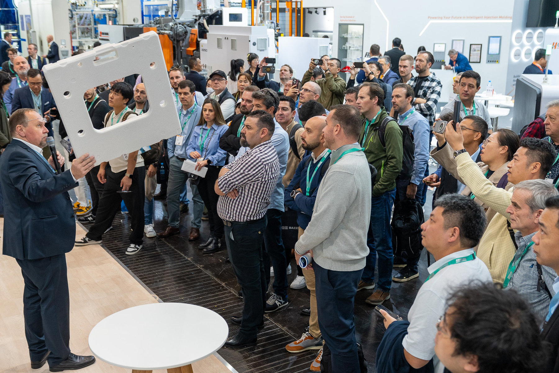 Riesige Aufmerksamkeit beim Kurtz PRO FOAMER M – ursprünglich sollte der teilautomatisierte Werkzeugwechsel zweimal täglich vorgeführt werden. Bereits am ersten Tag wurde dieser Plan jedoch verworfen und wir zeigten den Werkzeugwechsel aufgrund individueller Kundenwünsche fast durchgehend. Das Besondere: Für den Werkzeugwechsel braucht es nicht mehr als eine Person! Am Bildschirm wird der Werker durch die einzelnen Schritte geleitet, man benötigt keine Leitern oder sonstige Hilfsmittel. Der Wechsel ist somit auch für ungeübtes Personal sicher und schnell durchführbar.