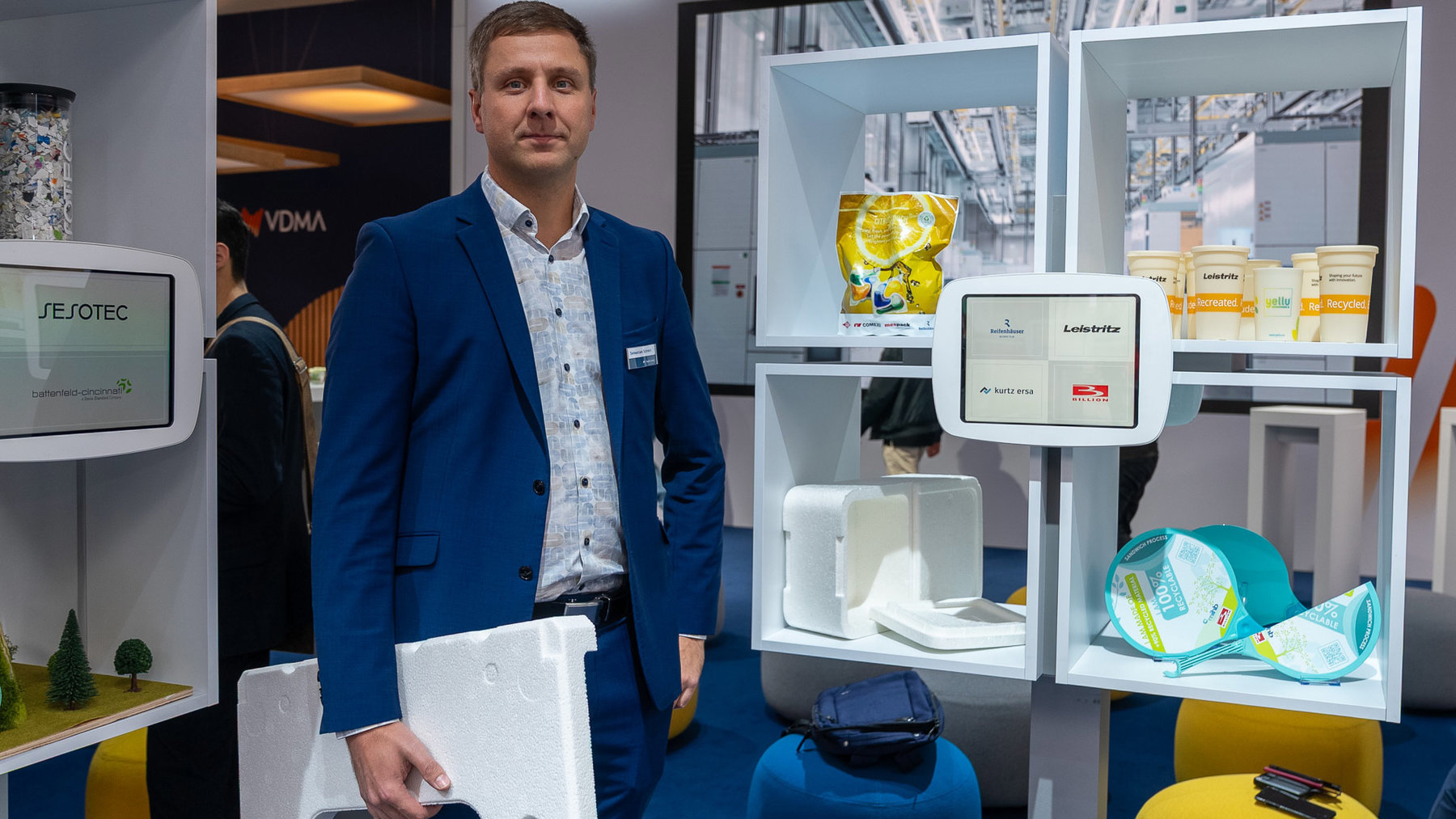 Kurtz partizipierte beim VDMA-Programm und stellte im Pavillon eine Lebensmittelkiste aus biologisch abbaubarem Rohstoff aus. Sales Manager Sebastian Schreck präsentierte, welche Möglichkeiten nachhaltige Rohstoffe bieten und wie energieeffizient sie sich etwa auf dem Kurtz WAVE FOAMER verarbeiten lassen.