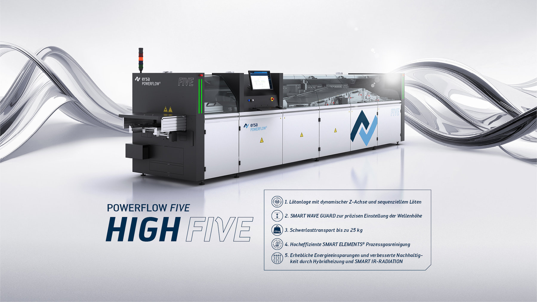 Mit der neuen POWERFLOW FIVE stellt Ersa auf der Productronica 2025 ein innovatives Wellenlötsystem vor, das dank fortschrittlicher Technologien neue Standards in Leistung, Flexibilität, Energieeffizienz und Gesamtbetriebskosten (TCO) setzt. Die Anlage richtet sich an Elektronikfertiger mit hohen Fertigungsvolumina und anspruchsvollen Anwendungen wie beispielsweise in der Leistungselektronik. Der Fokus des neuen Ersa Flaggschiffs liegt in der konsequenten Ausrichtung auf adaptive Produktionsprozesse, die sich flexibel an unterschiedliche Anforderungen anpassen lassen und dabei stets höchste Effizienz und Wirtschaftlichkeit gewährleisten.