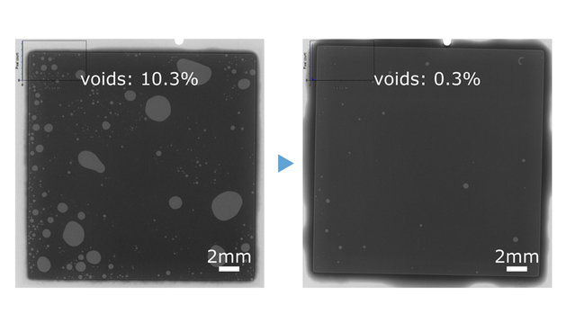 Voids im Lot beeinträchtigen die elektrische und thermische Leitfähigkeit und können zu Überhitzung, Korrosion oder frühem Bauteilversagen führen. Durch die gezielte Anwendung von Vakuum im Peak-Bereich des Lötprozesses werden Gaseinschlüsse zuverlässig entfernt und Void-Bildung auf ein Minimum reduziert. Das Ergebnis sind homogene Lötstellen mit optimierter Wärmeableitung, was zu einer deutlich erhöhten Zuverlässigkeit und Lebensdauer der Leistungselektronik führt.