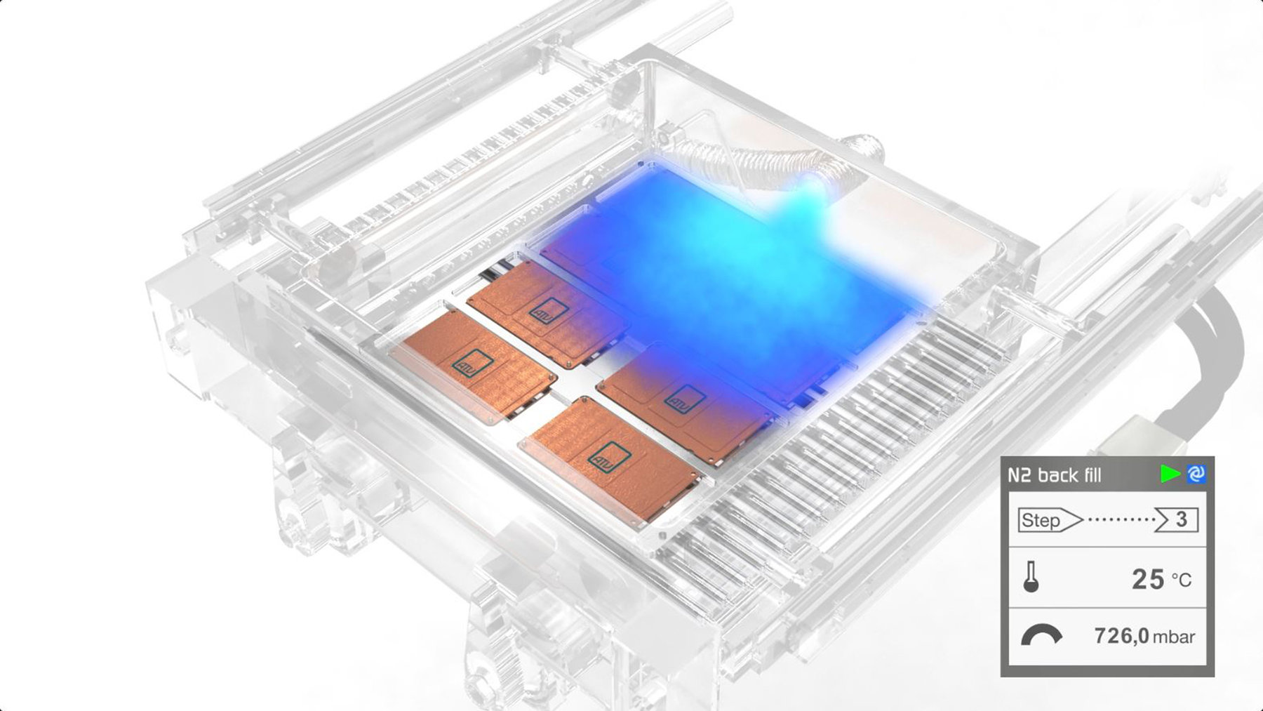 Die SRO-i-Line setzt neue Maßstäbe in der Serienfertigung und kombiniert maximale Effizienz mit exzellenter Prozesskontrolle. Dank des kompakten Designs und der Möglichkeit, bis zu drei Prozesskammern zu integrieren, maximiert die SRO-i-Line die Produktionskapazität, ohne zusätzlichen Platzbedarf. Kurze Zykluszeiten und fortschrittliche Vakuumlöttechnologie gewährleisten perfekte Ergebnisse für Anwendungen in der Mikroelektronik- und Halbleiterindustrie. Die leistungsstarke IR-Heiztechnologie sorgt für eine ausgezeichnete Temperaturhomogenität über die gesamte Arbeitsfläche, während das integrierte Ameisensäuresystem beste Benetzung garantiert und porenfreie Lötstellen sicherstellt.