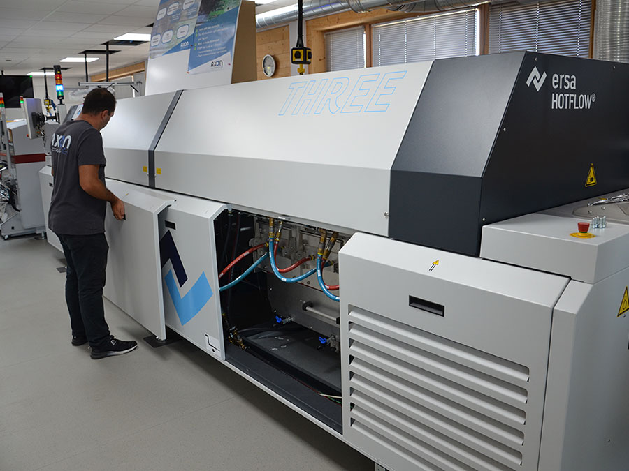 Bei der Beschaffung des neuen Reflow-Ofens war eine wesentliche Vorgabe ganz pragmatischer Natur: Aufgrund der örtlichen Gegebenheiten durfte die SMD-Linie nicht länger als maximal 17 m sein. Ergo war man auf der Suche nach einer kompakten Reflow-Anlage; allerdings bei möglichst hoher Taktrate und Leistung. Denn die technische Herausforderung war die zu lötende Baugruppe und die Taktvorgabe des Bestückers. Die Platine hat auf der Oberseite eine enge Bestückung mit vielen unterschiedlichen Bauteilen; die Unterseite weist nur wenige Bauteile auf. Alle 14 Sekunden verlässt eine Platine den Bestücker. Reicht also die Verweildauer der Platine in einem kurzen Reflow-Ofen aus, um alle Lötverbindungen sicher herzustellen? Die Anfrage bei Ersa war für AXON eine logische Konsequenz. Ersa hat mit der HOTFLOW THREE 16 eine kompakte und sehr leistungsfähige Reflowanlage mit 8 Prozesszonen bei einer Maschinenlänge von 5,60 m im Portfolio, die den Anforderungen gerecht wurde.