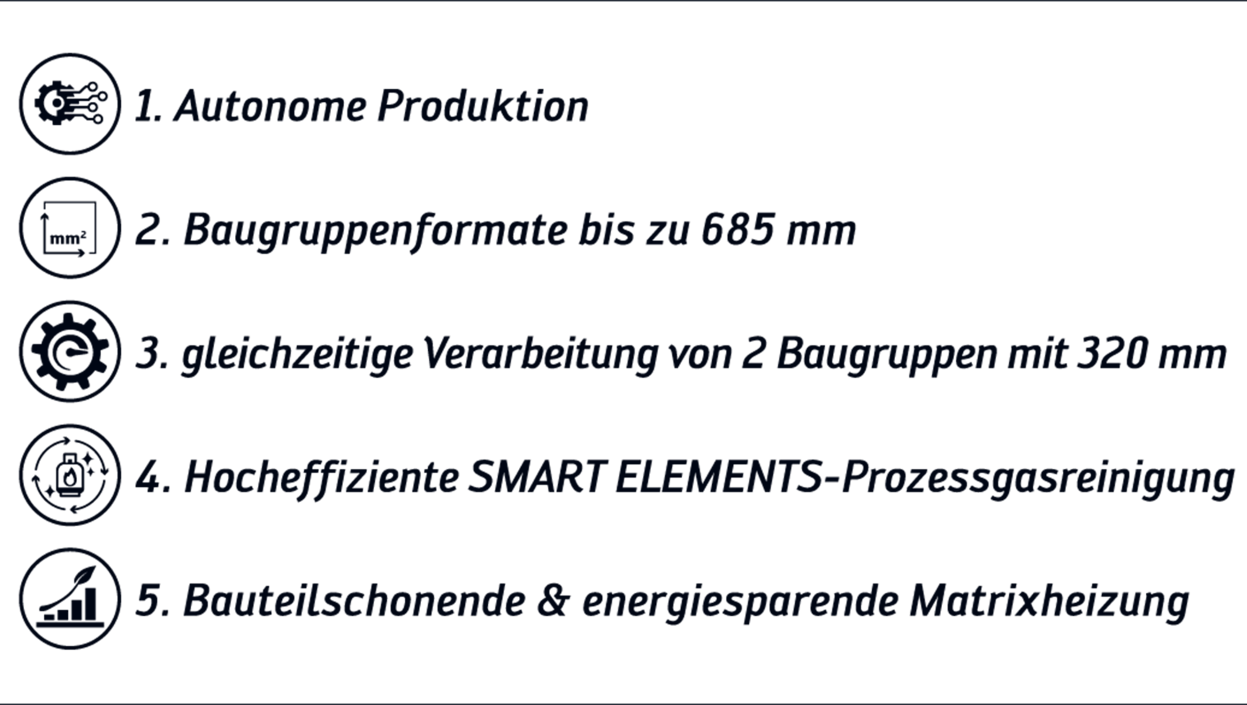 - SMART ELEMENTS® Prozessgasreinigung: Diese Technologie der POWERFLOW FIVE verlängert Betriebszeiten durch reduzierte Kontamination um bis zu 30%, was sowohl Energiekosten für häufige Reinigungszyklen als auch Produktionsausfälle minimiert. Die granulierte Absorptionstechnologie senkt Rückstände um bis zu 60% und verbessert gleichzeitig die Lötqualität.