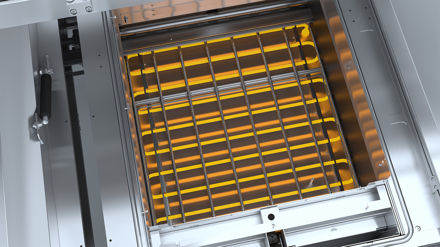 Modulbezogene LED-Streifen direkt an den jeweiligen Maschinenmodulen dienen als visuelle Statusanzeige. Sie ermöglichen es dem Bedienpersonal, auf einen Blick den aktuellen Betriebszustand zu erkennen. Dadurch können manuelle Eingriffe gezielt und schneller erfolgen, ohne dass der Bediener zunächst an der HMI nachsehen muss. Dies erhöht die Effizienz bei Rüst- und Wartungsvorgängen und reduziert Stillstandszeiten.
