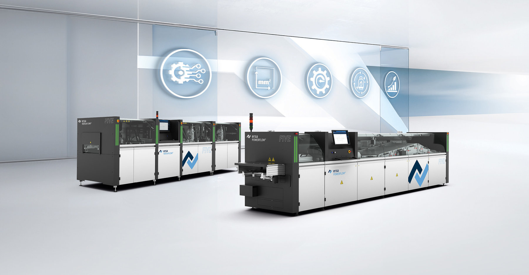 Sowohl VERSAFLOW FIVE als auch POWERFLOW FIVE verfügen über die neuesten Software-Features von Ersa. Beide nutzen die preisgekrönte ERSASOFT 5 Bedienoberfläche. HERMES und IPC-CFX Schnittstellen sind, wie weitere MES-Anbindungen, verfügbar, ebenso wie die Anbindung an Kurtz Ersa CONNECT. Zusätzlich zu den smarten Features in der digitalen Welt unterstützt die VERSAFLOW FIVE den Shopfloor noch mit ihrer intelligenten Statusanzeige auf Modulebene.