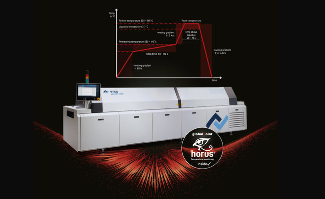 Die Forderungen der Elektronikfertigung nach porenfreien Lötverbindungen - vor allem für Leistungselektronik und Hochzuverlässigkeitstechnik - beantwortet Ersa mit der EXOS 10/26, einer Konvektions-Reflowlötanlage mit 22 Heizkammern und 4 Kühlzonen sowie einer Vakuumkammer nach der Peak-Zone, mit der sich die Voidrate um bis zu 99% senken lässt. Dank intelligenter Features kann die EXOS 10/26 besonders wirtschaftlich und "void-free" produzieren.