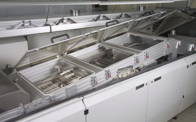 Die wartungsfreundlichen Löttiegel können komfortabel elektrisch aus der Anlage herausgefahren werden. Ein Beispiel aus dem Ersa Düsenportfolio ist die patentierte Vario-Wave, in der die gesamte 100-jährige Ersa Löterfahrung steckt: Diese Düse verfügt über eine herausragende Dynamik und ein sehr gutes Abfließ- und Abrissverhalten. Dadurch ist sie besonders gut für Masken mit tiefen Taschen geeignet - ebenso zum Löten schwieriger SMD-Geometrien auf der LP-Unterseite.